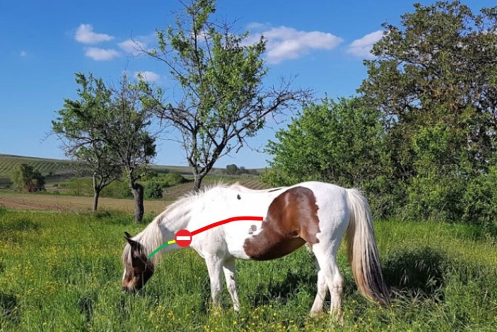- Tête basse, encolure allongée : Une posture typique où le cheval tente de soulager la pression ou de faire passer le bouchon.