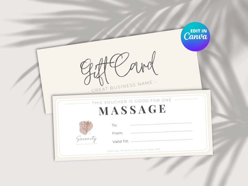 Imaginez un chèque cadeau arborant fièrement votre logo, vos couleurs, et une typographie qui reflète l'ambiance sereine de votre espace. Chaque fois que ce chèque est vu, il renforce la reconnaissance de votre marque. C'est une publicité ambulante, un ambassadeur silencieux qui parle de la qualité et de l'authenticité de vos services. Les détails comptent, et un chèque cadeau bien conçu montre que vous êtes attentif à chaque aspect de l'expérience client, avant même que le massage ne commence.