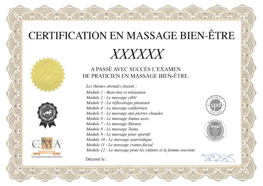 Pour ceux qui souhaitent se concentrer spécifiquement sur le massage bien-être, la Fédération Française de Massages Bien-Être (FFMBE) agrée 32 organismes de formation en France. Cette formation est conçue pour être complète et professionnalisante. Elle comprend :
